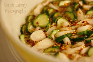 wash and dry a 1-quart canning jar (or larger). ladle the cucumbers, onions, and juice into the jar. be careful, it is really hot and can burn you through the bowl or the jar. i have an ove glove that i keep around because it's seriously the best for handling hot pans and dishes. if you use a 1-quart jar, all of the juice will not fit, but that's ok. put the lid on the jar and refrigerate (these are not regular pickles - you must refrigerate them).